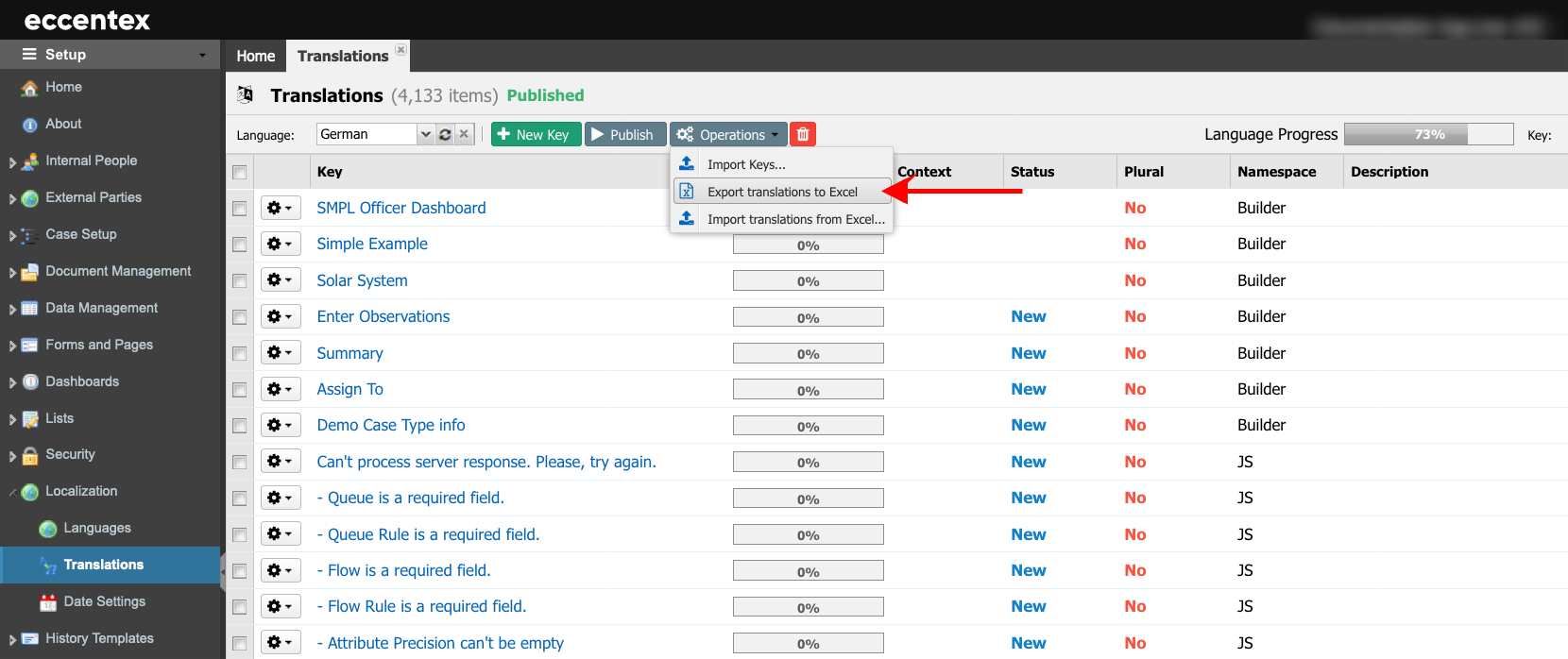 If you need to add many key translations, using a Microsoft Excel spreadsheet to manage the translation equivalents could be better than the web UI. For instance, once the keys have been created, they can be exported as an Excel spreadsheet. An administrator/translator then applies the translations into the spreadsheet and imports them back into the solution.