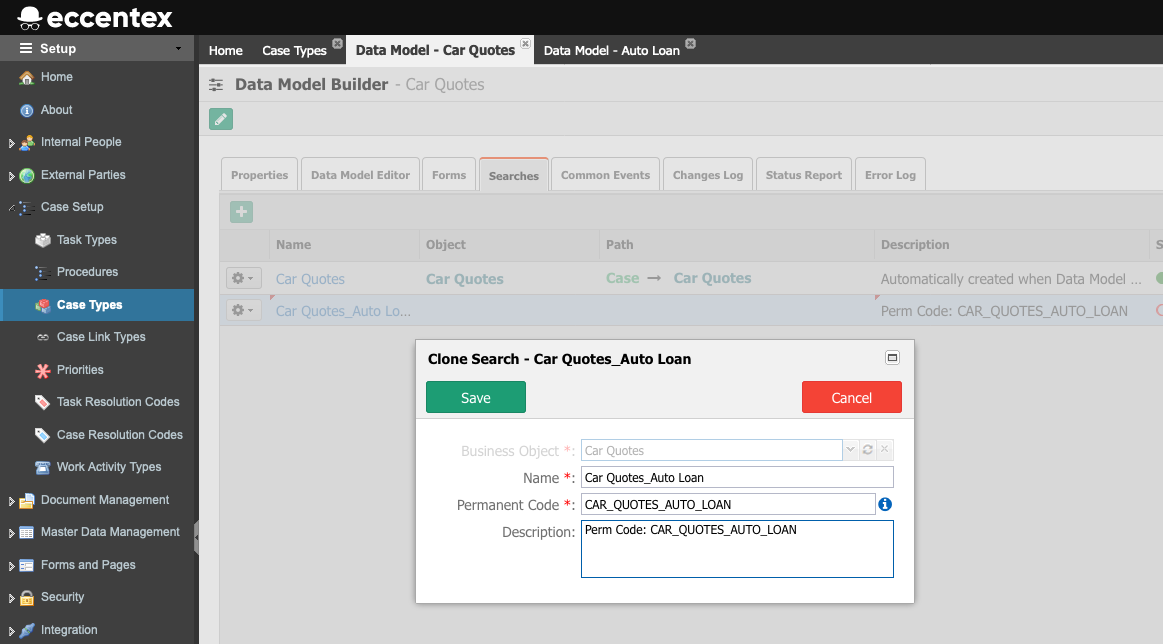 - Clone the default search form. In our example, we name it Car Quotes_Auto Loan.