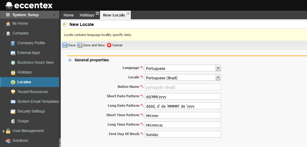 Navigate to Company → Locales and the current company profile information will be displayed.