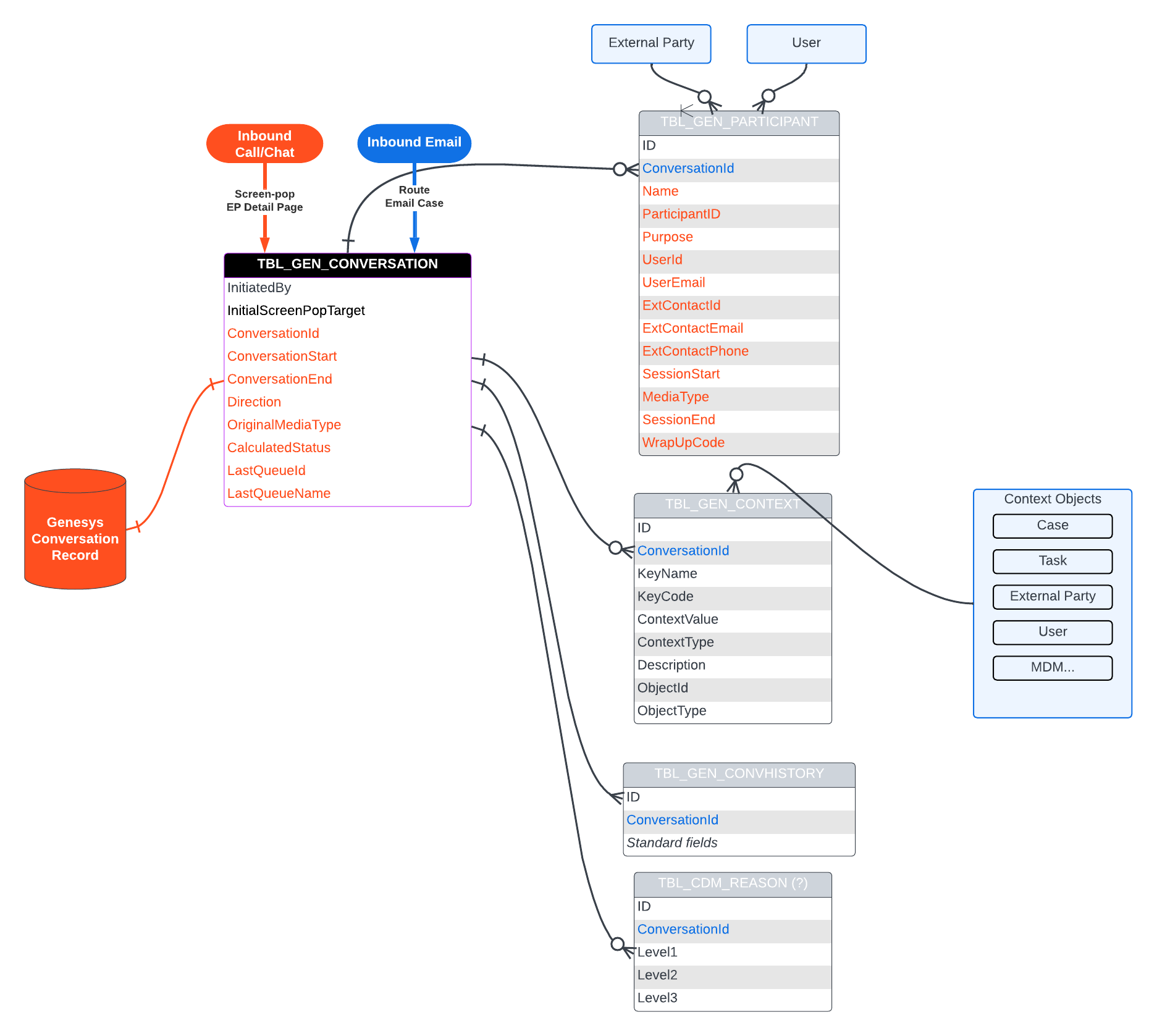 The TBL_GEN_CONVERSATION is a top-level table in DCM that tracks all the Genesys Conversations that DCM is involved in.