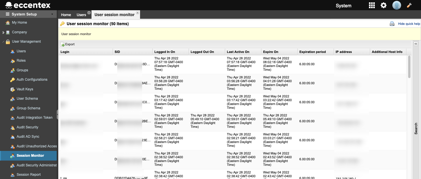 The Session Monitor page displays information about user sessions, their date and time login/logout, last activity, session end date, expiration period, IP address from which the login occurred, etc.